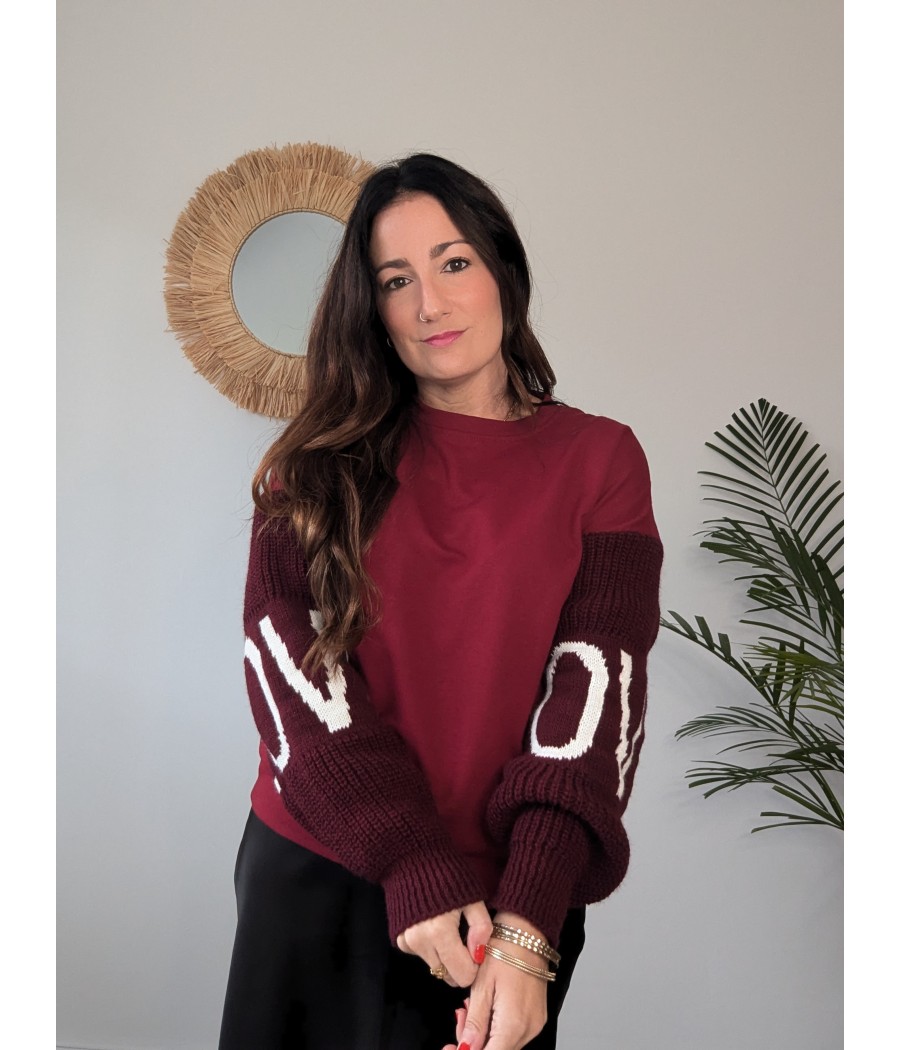 Descubre nuestra exclusiva sudadera, esta prenda destaca por sus elegantes mangas de punto, donde se encuentra bordada la palabra "love" que añaden un toque de ternura y personalidad a tu look